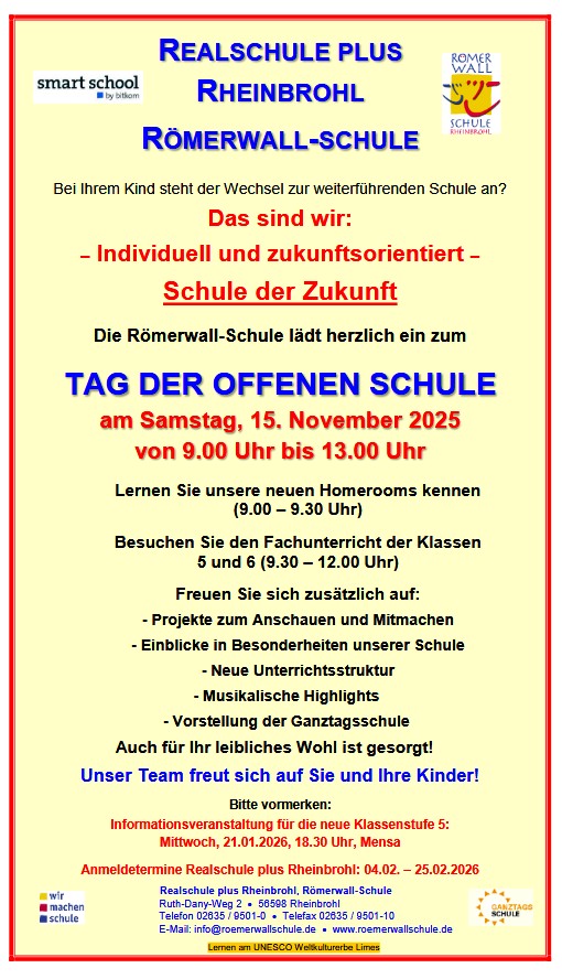 Für weitere Rückfragen stehen wir selbstverständlich jederzeit zur Verfügung. Terminvereinbarungen können telefonisch unter der Nummer 02635 – 9501-0 oder unter der Mailanschrift info@roemerwallschule.de erfolgen.