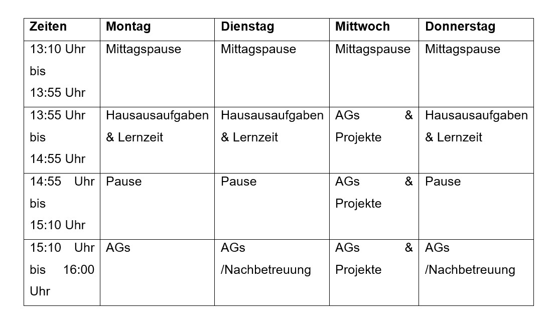 Montags, dienstags und donnerstags nehmen die Schülerinnen und Schüler an AGs teil, die sie nach Interesse wählen. An Dienstagen und Donnerstagen ist eine Nachbetreuung vorgesehen, wenn Hausaufgaben noch nicht abgeschlossen sind. Das bedeutet, dass eine Teilnahme an der AG nur möglich ist, wenn die Hausaufgaben vollständig für den nächsten Tag erledigt sind. Mittwochs finden ausschließlich AGs statt.